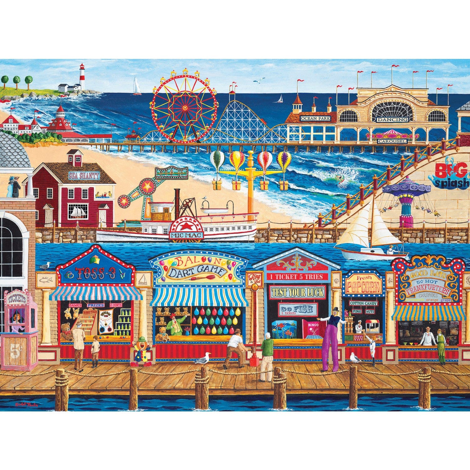 This 400pc Family Hour Collection are the perfect puzzles to enjoy with the family. Ocean Park Family Hour Puzzle features an ocean side town with activities on the pier and local shops to explore on a beautiful summer day. It's the perfect piece count to keep everyone puzzling together. This puzzles die was hand drawn to change from smaller to larger pieces across the puzzle. A variety of puzzle piece sizes are included so that there is a section for everyone. With three variations in piece sizes, it will be fun for everyone!