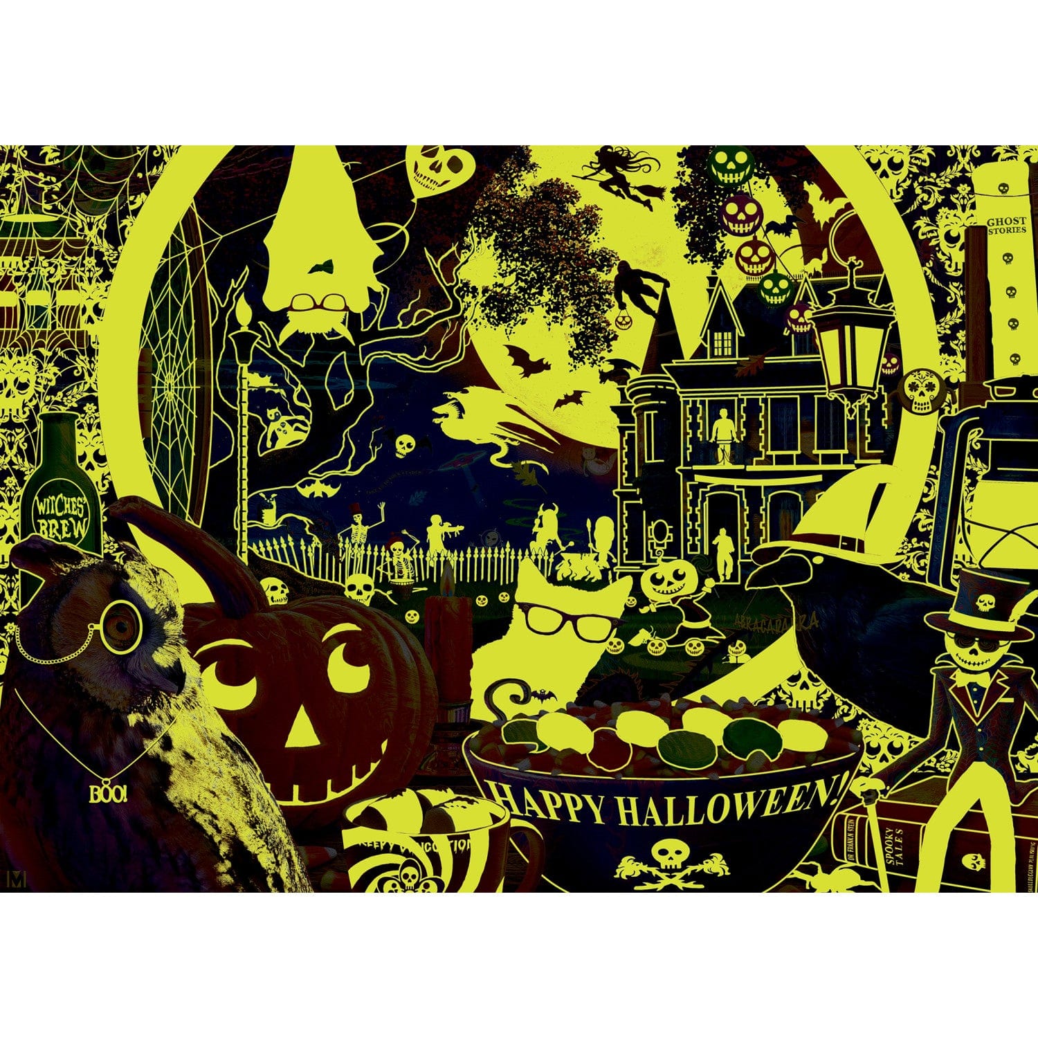 Safe inside with candy and cocoa while outside Halloween dangers lurk around every corner, the black cat, witch's crow, dancing skeleton and wise old owl gather for a night to celebrate.