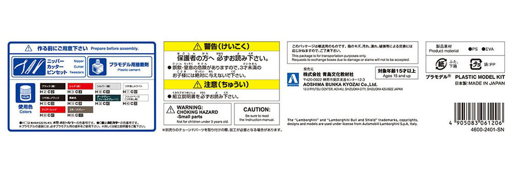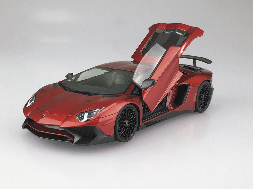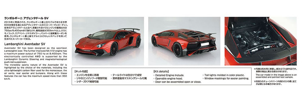 - The Super Veloce (SV), a superior model of the Aventador, was introduced in 2015. It has been spartanized with an exclusive exterior and a power unit raised to 750 PS. ・Replicated details of the interior and exterior and engine. ・Engine hood can be opened and closed, allowing you to admire the assembled engine even after completion ・Scissors doors, a characteristic of Lamborghini, can be replicated in the open state even after assembly ・Molded color pre-colored tail lamp ・Masking stickers for painting window frames included