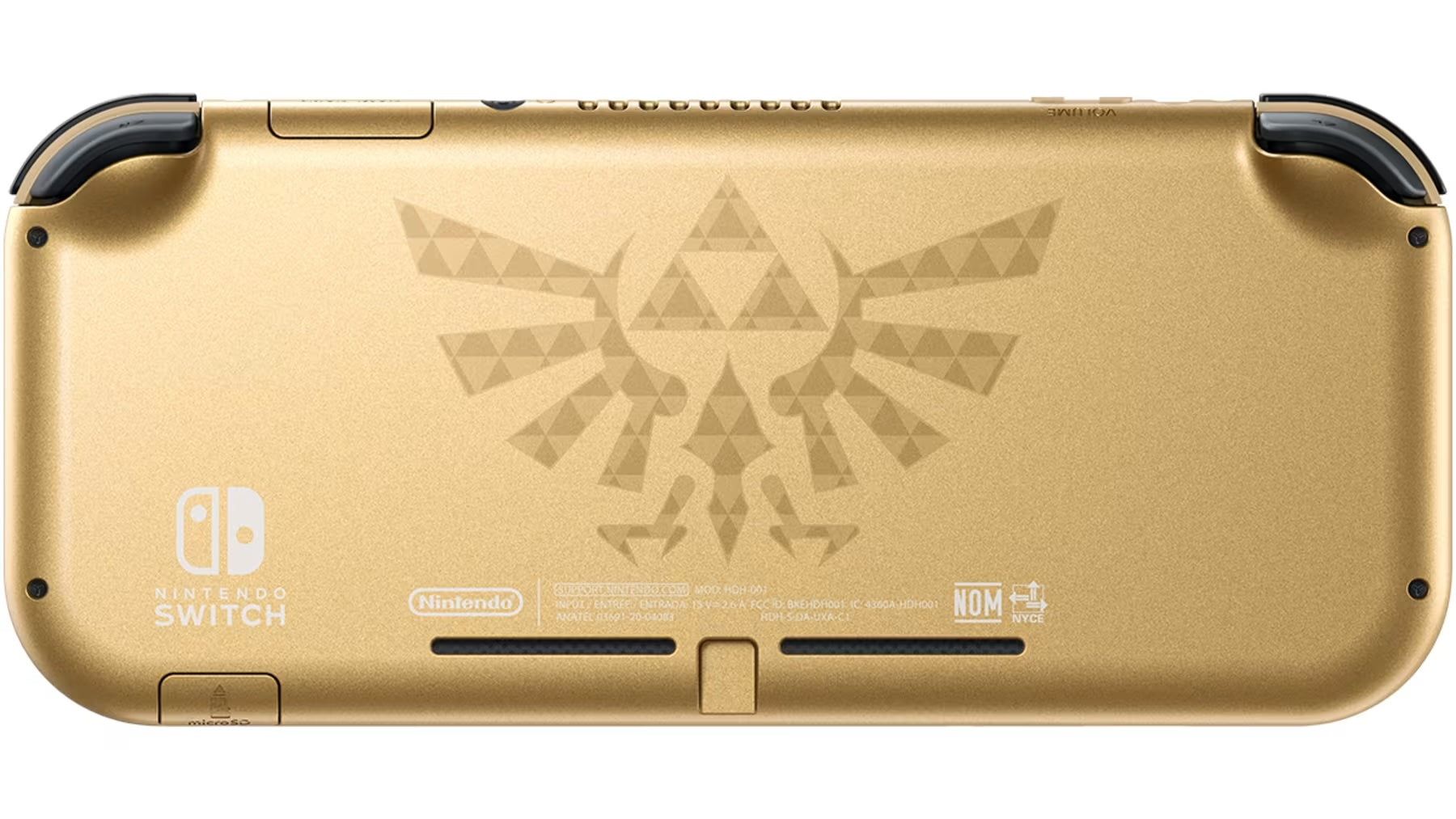 The Nintendo Switch Lite: Hyrule Edition with Bonus Nintendo Switch Online + Expansion Pack features a stunning gold-colored design inspired by the Legend of Zelda™ game series, with the iconic Hylian Crest proudly displayed on the back.