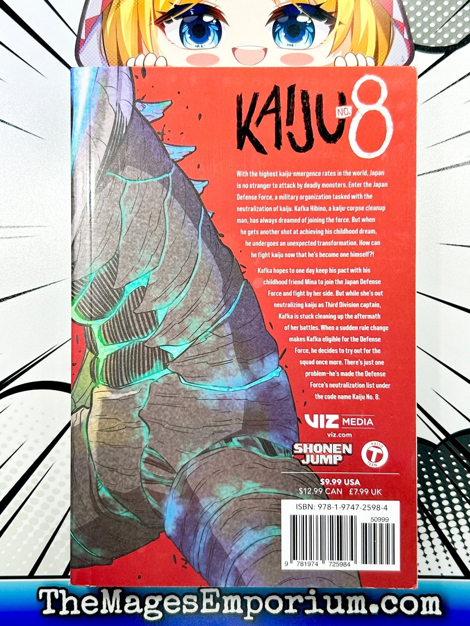 In this first volume, written and illustrated by the talented team behind the series, you'll meet our protagonist, Kafka Hibino, a low-ranking member of the Defense Force who dreams of becoming a hero. However, Kafka's life takes an unexpected turn when he finds himself facing a colossal monster known as a Kaiju. In a twist of fate, Kafka not only survives the encounter but discovers that he has transformed into a Kaiju himself - the enigmatic Kaiju No. 8!
