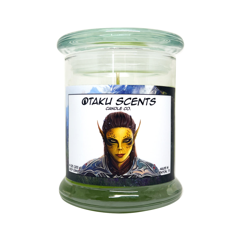 Inspired by Lae'zel's brisk and rough behavior, this scent is an earthy and spicy blend of greens, citrus, lily, clove, patchouli, and vanilla.
