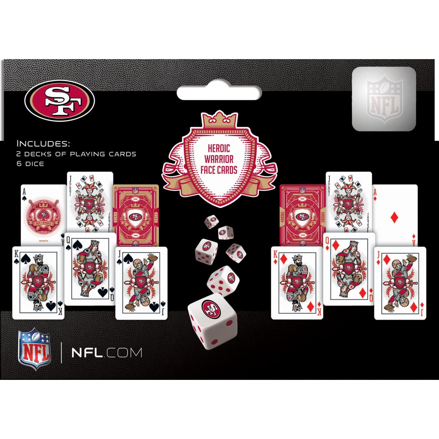 Who says you can't bring the casino to your next game night? These Officially Licensed NFL San Francisco 49ers 2-pack playing card and dice sets are perfect for any game night. The high-quality Casino Style Cardstock playing cards are perfect for any fan of the San Francisco 49ers. The deck features a unique team design and comes with a 6-piece 16mm D6 gaming dice set. Whether you're playing some poker or trying to beat the dealer at blackjack, these cards will help you do it in style. So roll the dice and get ready to bet big, because, with this set, you're going to win big. Go Team!